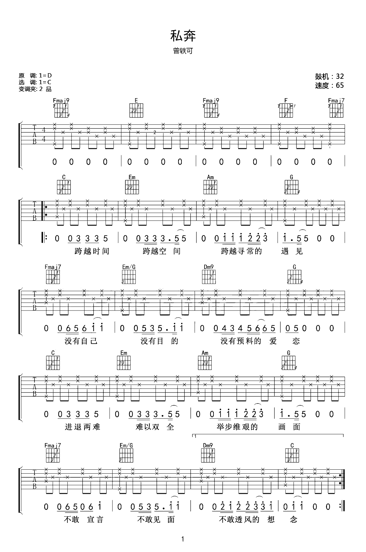 吉他谱 | 曾轶可《私奔》