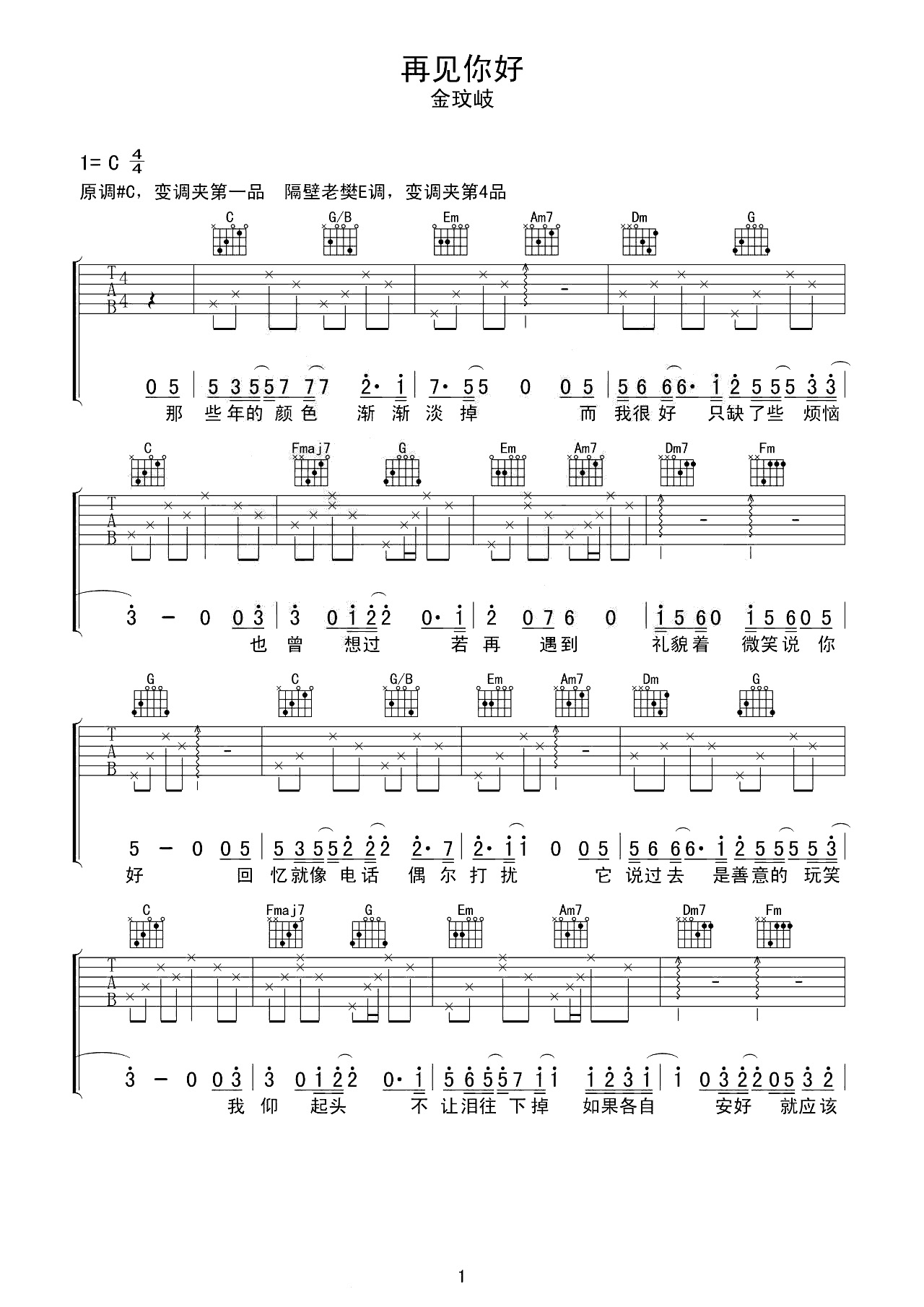 吉他谱 | 热门弹唱《再见 你好》