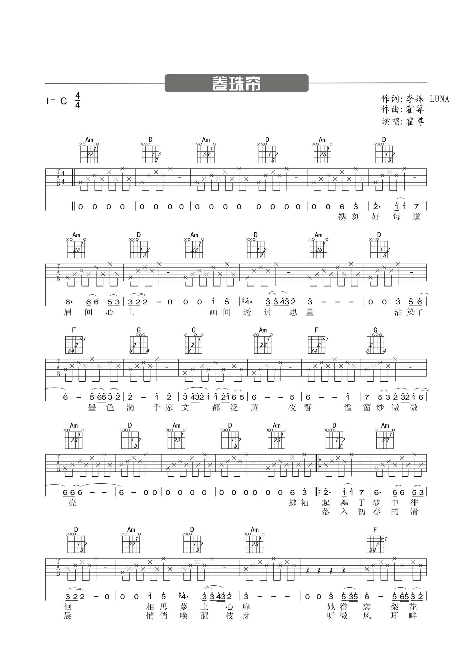 吉他谱 | 热门弹唱《卷珠帘》