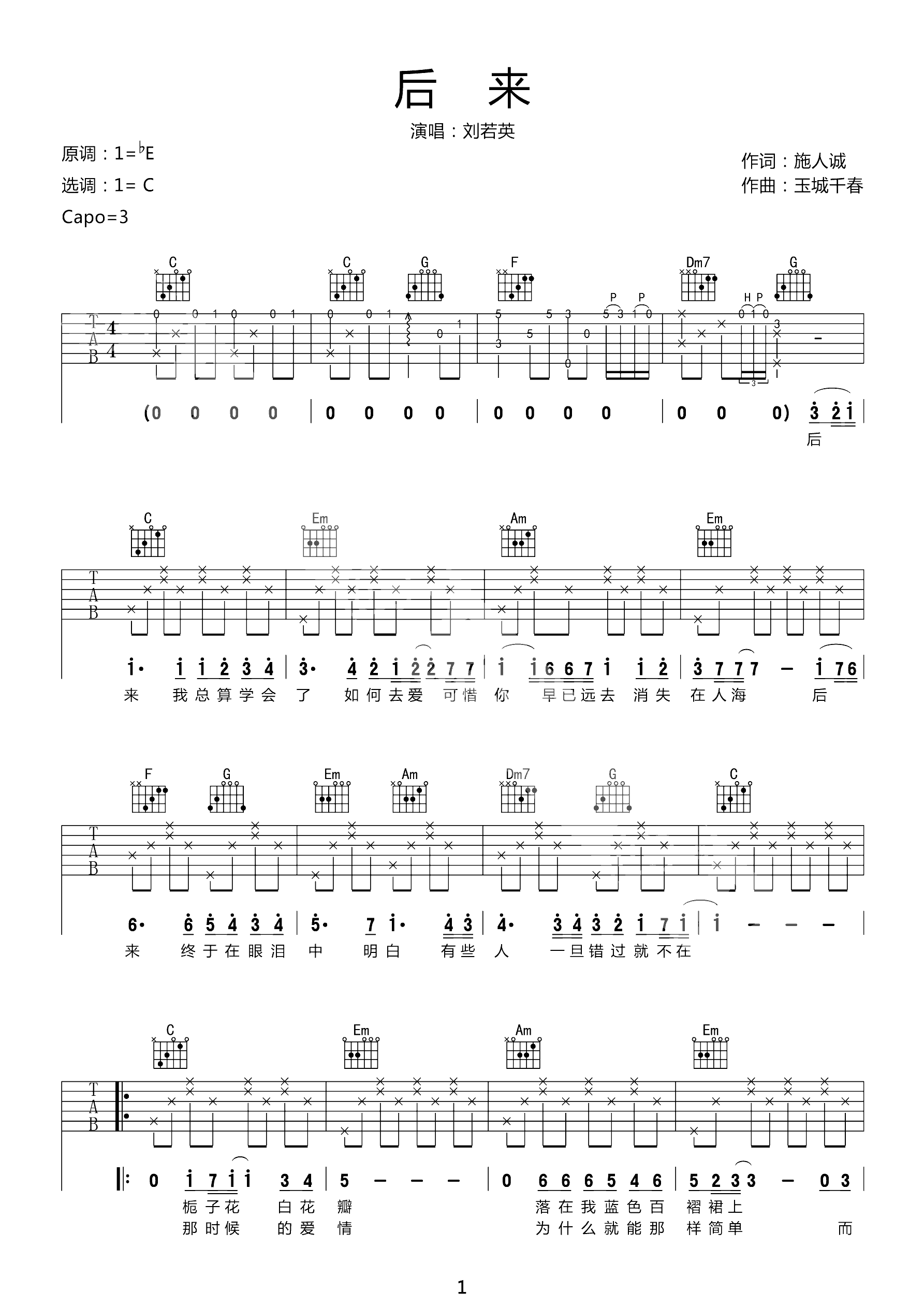 时间轴吉他谱 刘嘉慧版本 C调弹唱谱 中