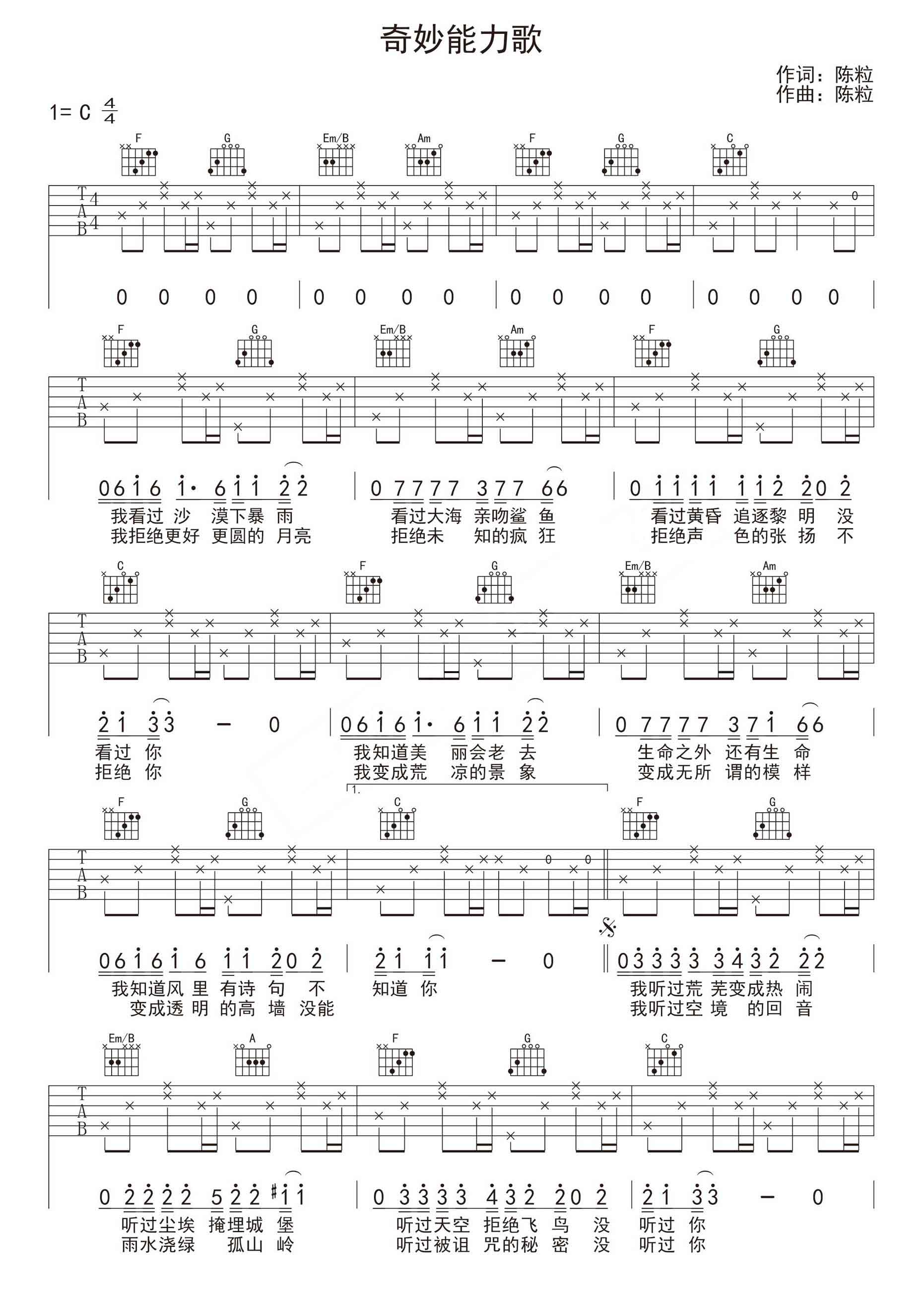 吉他谱 | 入门弹唱《奇妙能力歌》